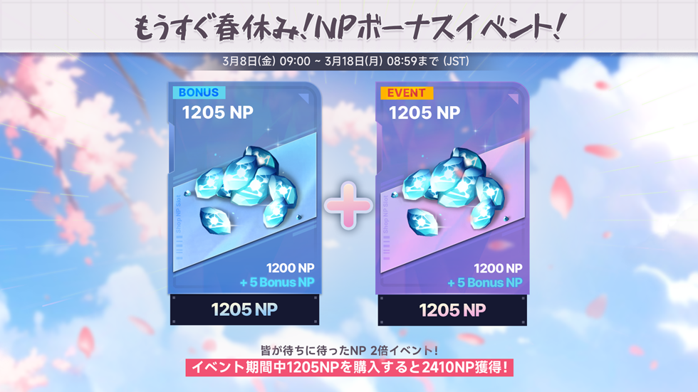 イベント期間中、1,205NPをご購入いただく場合、アカウントあたり1回に限って2,410NPを獲得できます。