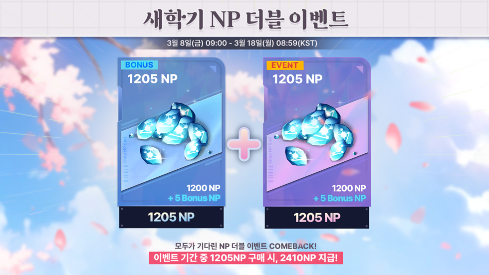 이벤트 기간 동안 1,205NP를 구매 시 계정당 1회에 한해 2배인 2,410NP를 얻으실 수 있습니다.