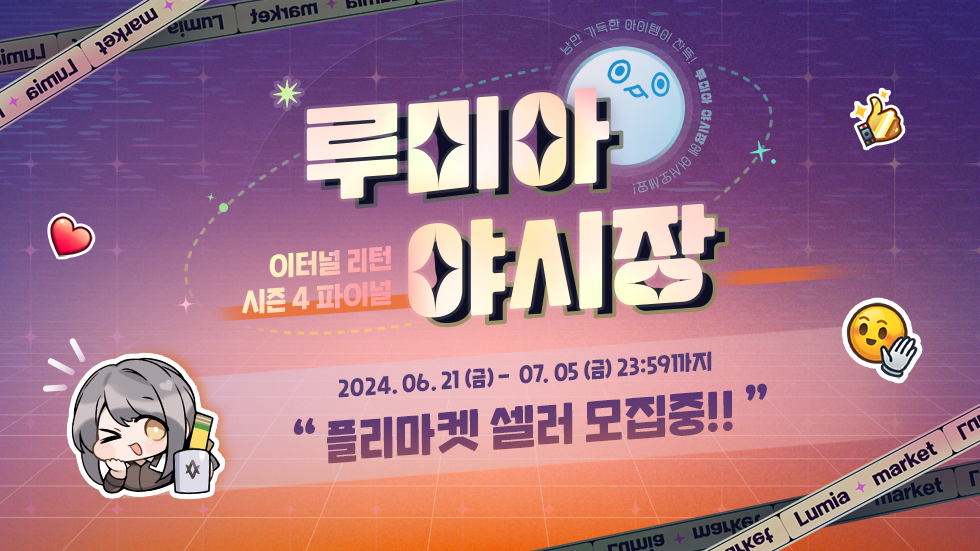 8월 9일(금)부터 8월 10일(토)까지 0시 축제가 진행되는 일류경제도시 대전에서 2일간 진행될 금번 ‘루미아 야시장’에 이터널 리턴 관련 상품을 직접 기획하고 판매 운영하실 '생존자 셀러'를 모집합니다.
