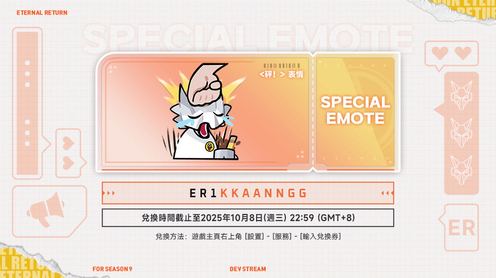 此次開發者見面會中公布的<砰!>表情兌換券如下,還請倖存者們在期限內盡快領取。