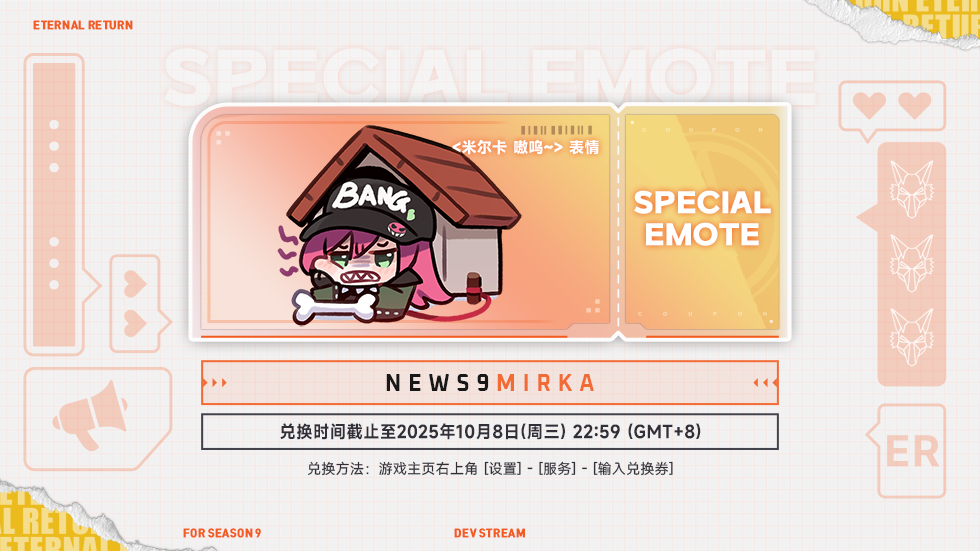 此次开发者见面会中公布的<米尔卡 嗷呜~> 表情兑换券如下,还请幸存者们在期限内尽快兑换奖励。