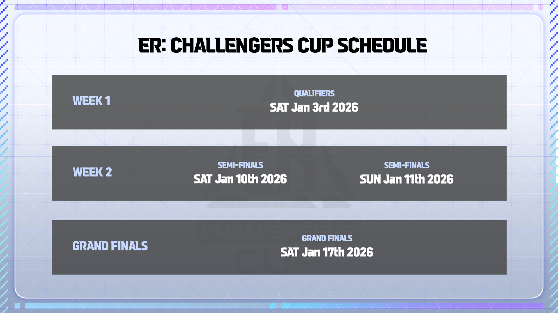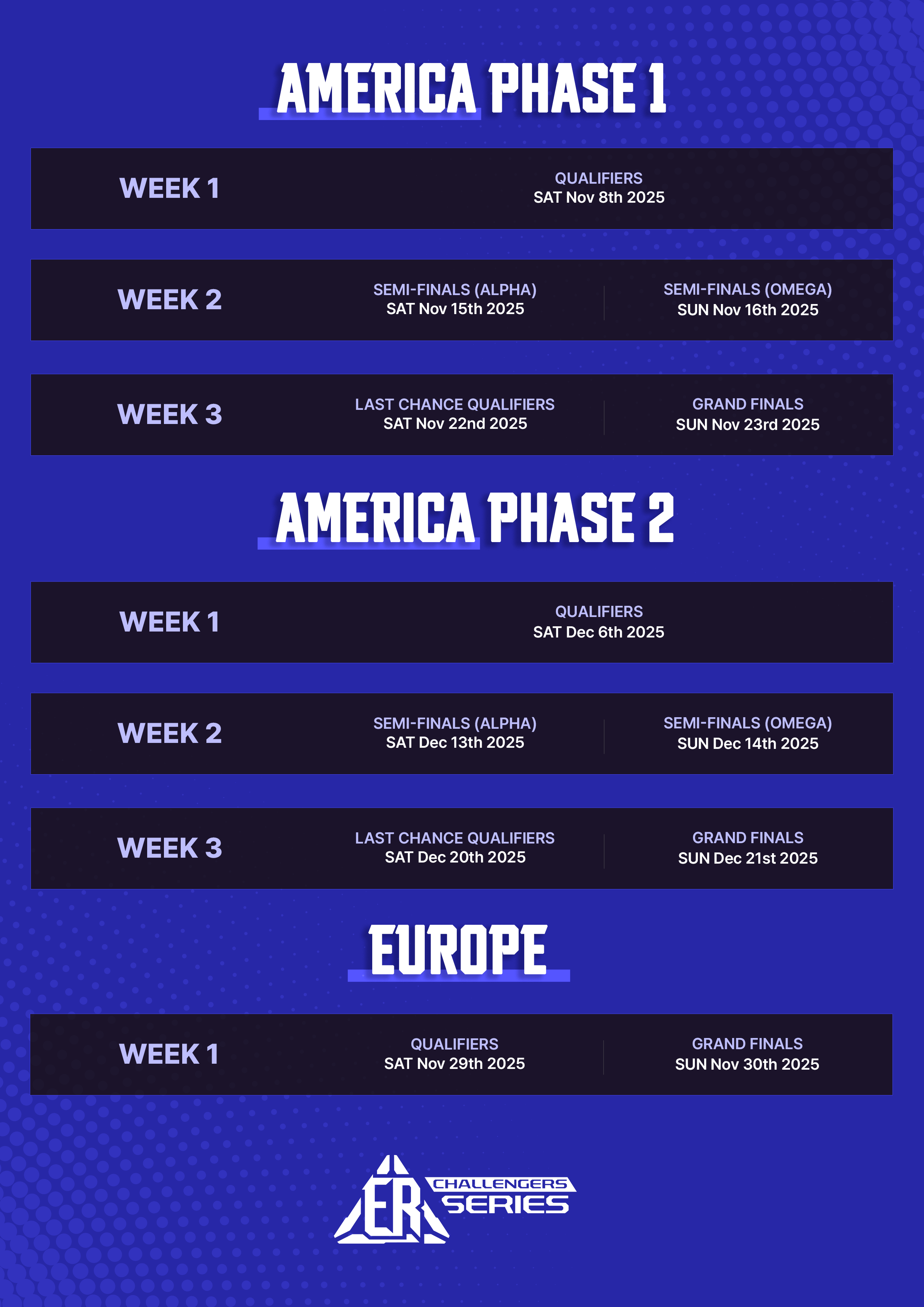 *In each phase, the 1st and 2nd place teams will secure their spots in the ER: Challengers Cup.