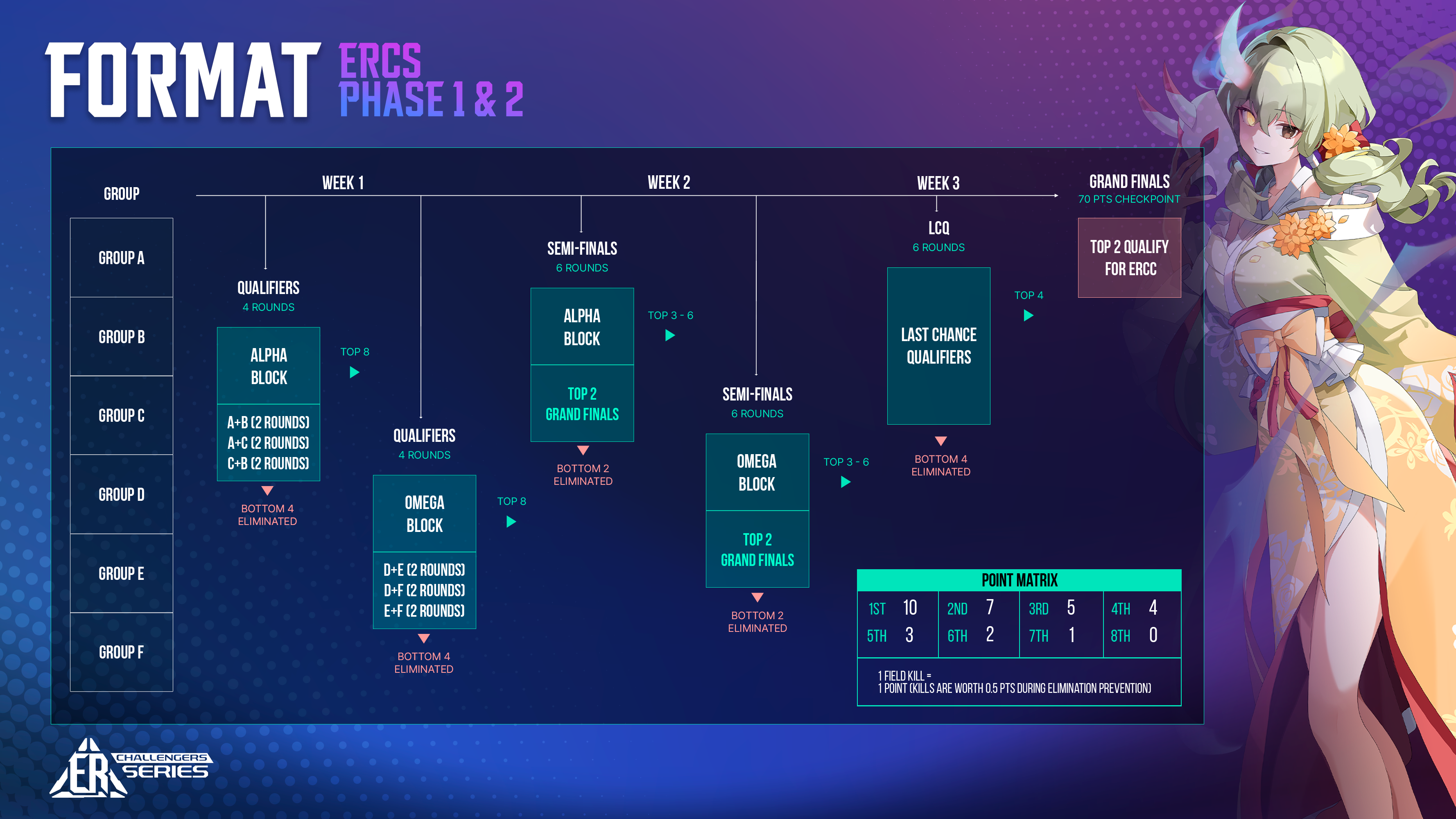The top 2 teams from ERCS Phase 1 & 2 will receive direct entry into their blocks for ER: Challengers Cup. Team rosters must remain the same for both events.