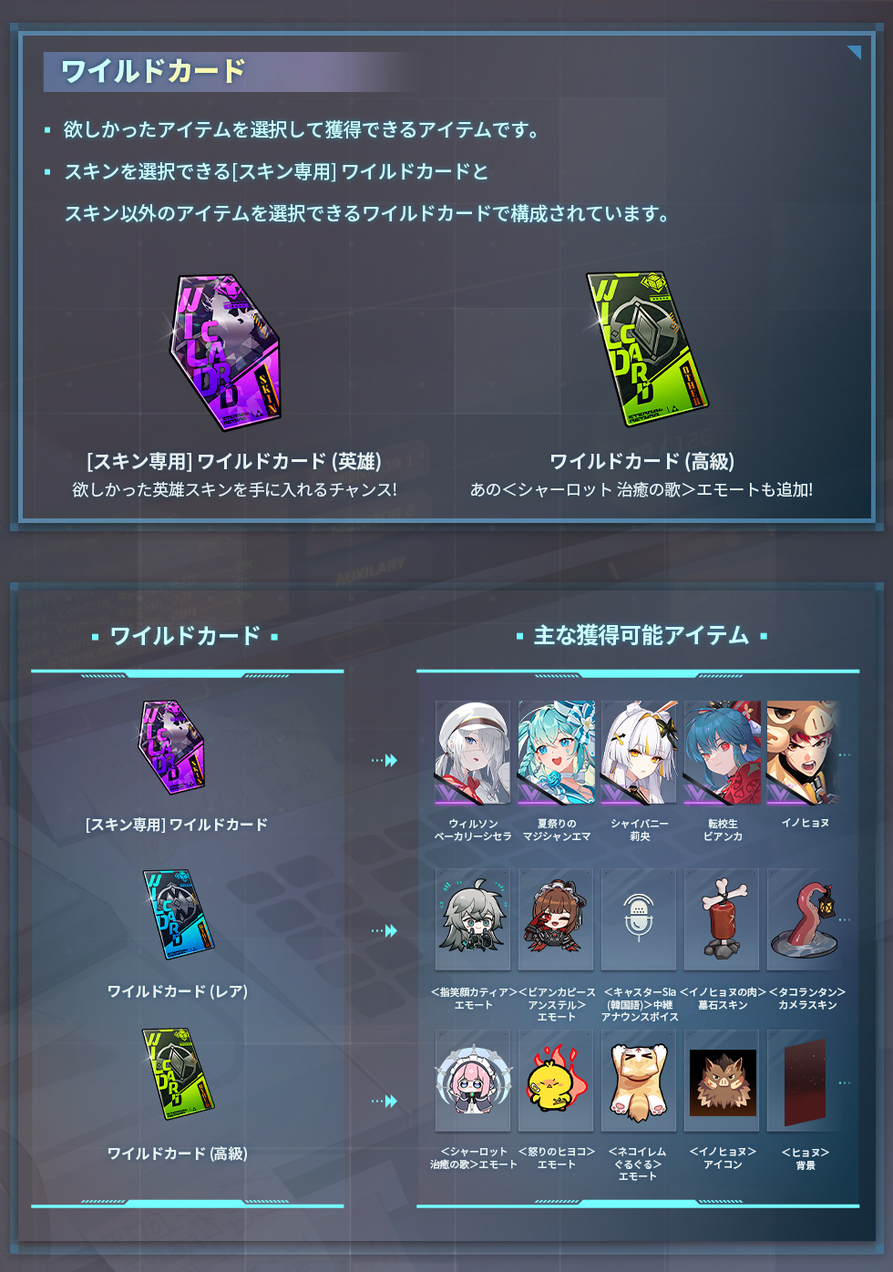 ※ スキン選択券、データボックス、ワイルドカード、選別補給カードから得られるアイテムはゲーム内のアイテムリストからご確認いただけます。