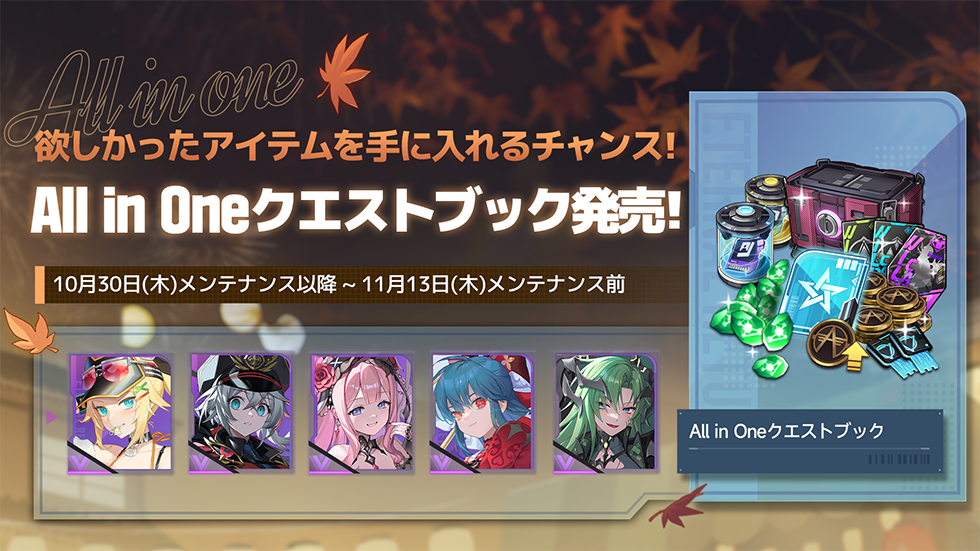 - 「All in Oneクエストブック」は10月30日(木)メンテナンス以降から11月27日(木)メンテナンス前まで利用でき、以降には利用できません。