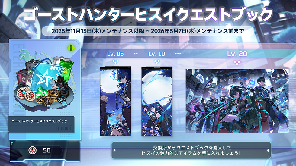 ※ 「ゴーストハンターヒスイクエストブック」は購入と同時に有効化され、ロビーの「QUEST BOOK」メニューからご確認いただけます。