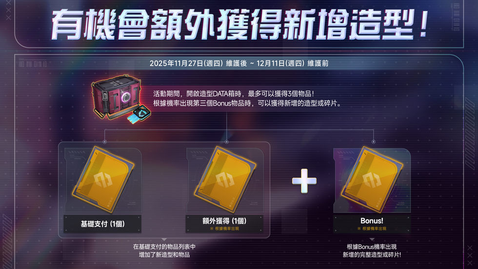 因此活動期間開啟造型DATA箱時,可獲得的數量由原先的1~2個物品,增加至最多可以獲得1~3個物品!