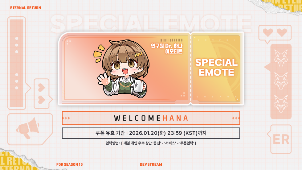안녕하세요, 루미아 섬의 생존자 여러분.개발팀과의 만남에서 공개된 연구원 Dr. 하나 이모티콘 쿠폰 안내 드립니다.