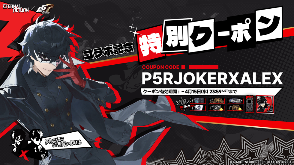 今回コラボの初スキンの主役、アレックスとジョーカー(P5R)の出会いを記念し、特別なクーポンをご用意いたしました!