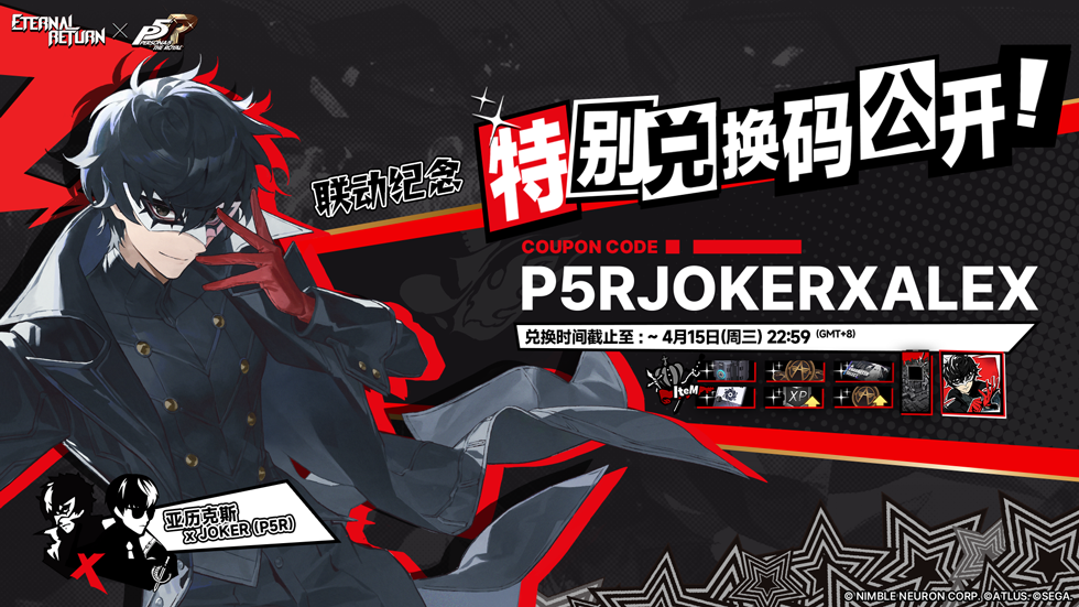 - 兑换码礼物 : 亚历克斯 (JOKER)头像,P5R D-DAY 队伍格背景, 赛季碎片包(一般)x 5(立即开启),研究中心DATA箱*1,2000 A-Coin, 实验体选择券 *1, XP Boost (7日),A-Coin Boost (7日)