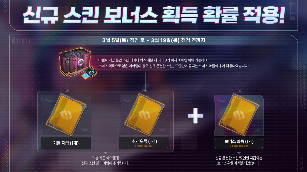 그에 따라 스킨 데이터 박스 개봉 시 1~2개 아이템 획득 가능에서 1~3개까지 아이템 획득이 가능하게 되었습니다.