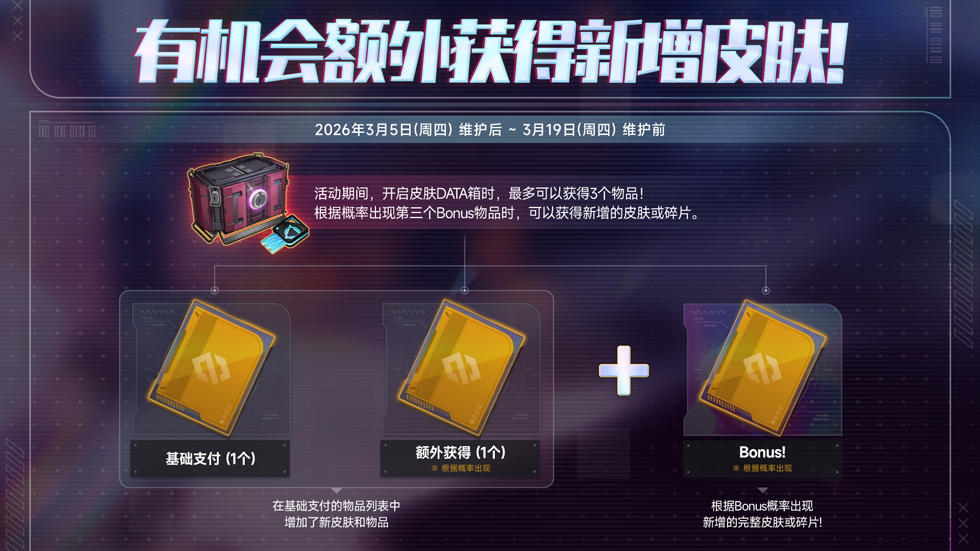 因此活动期间开启皮肤DATA箱时,可获得的数量由原先的1~2个物品,增加至最多可以获得1~3个物品!