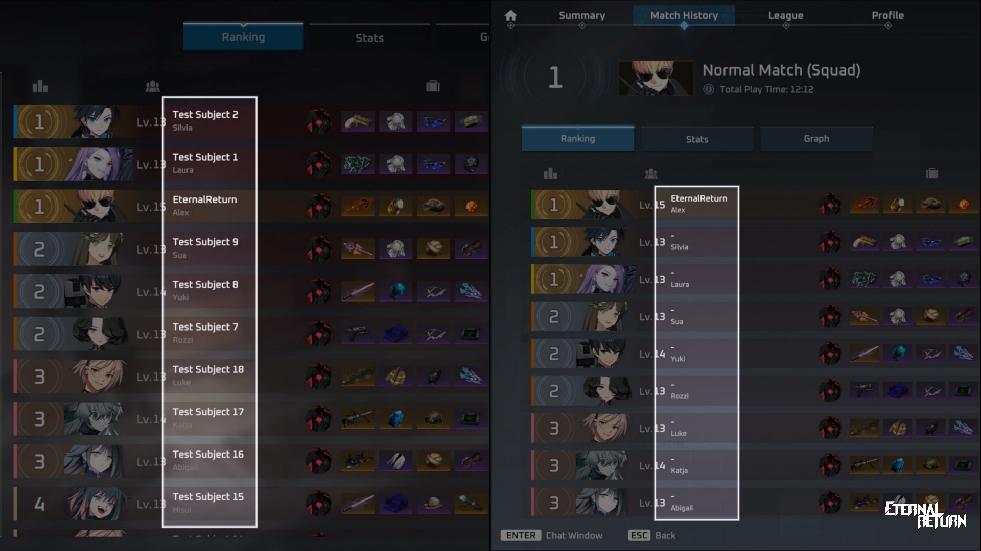 Character Name Display on Match History Leaderboard