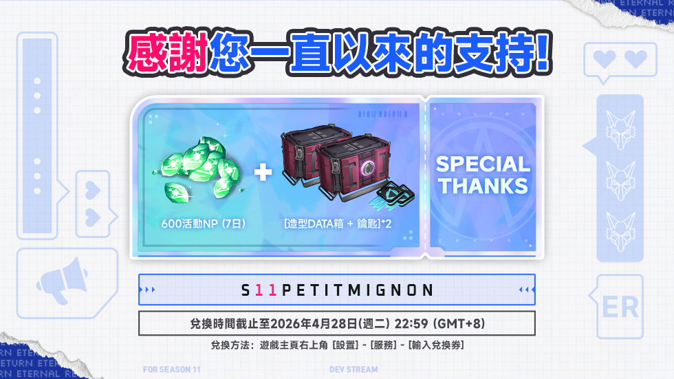 此次開發者見面會中公布的兌換券如下,還請倖存者們在期限內盡快領取。